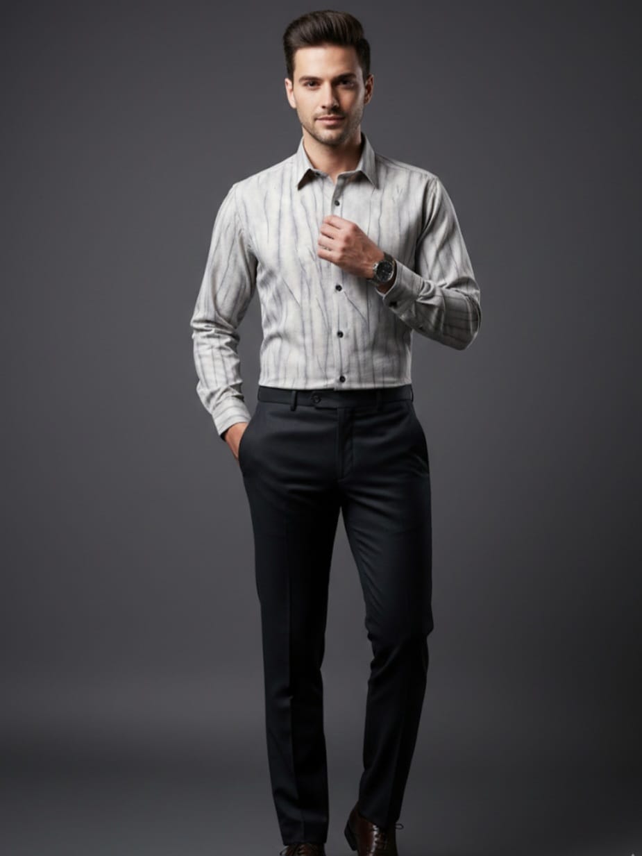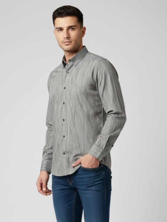 the fabric displays a visible weave and a structured drape, typical of high-quality shirting materials.