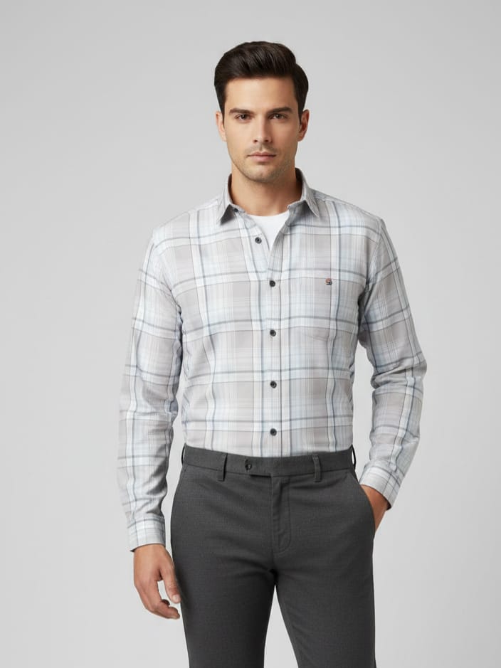 A contemporary button-down shirt featuring iconic monogram motifs and cursive branding across the chest.